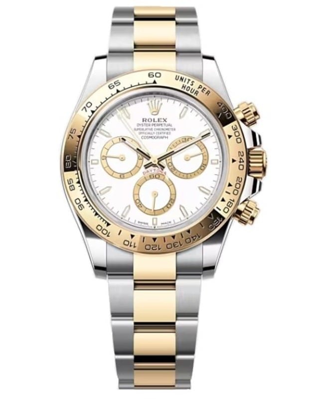 Brand New Authentic Rolex Cosmograph Daytona Stainless Steel and Yellow Gold White Dial Men’s Luxury Watch Model M126503-0001. Brushed and Polished Yellow Rolesor (Combination of Oystersteel and Yellow Gold) case with Brushed and Polished Yellow Rolesor (Combination of Oystersteel and Yellow Gold) Oyster Style Bracelet watch band. Oysterclasp clasp. Fixed, with Engraved Tachymetric Scale, in Yellow Gold. bezel. Dial description: Luminescent 18k Yellow Gold Hands and Stick Hour Markers with 3 Sub-Dials; 30 Minute at 3 o’clock, 60 Second at 6 o’clock, and 12 Hour at 9 o’clock, Displayed on a White dial. Perpetual, Mechanical Chronograph, Self-Winding. movement. Chronograph sub-dials display: 60 Second, 30 Minute, 12 Hours. Powered by Rolex Caliber 4131 engine with 72 hours power reserve. Watch functions: Power Reserve, Hour, Minute, Second, Chronograph, Speed. Screw-Down crown. Scratch Resistant Sapphire crystal. Round case shape. Case size: 40mm. Monobloc Middle Case, Screw-Down Case Back and Winding Crown.. 100 Meters – 330 Feet water resistant. 5-year WatchMaxx warranty. New 2023 Model