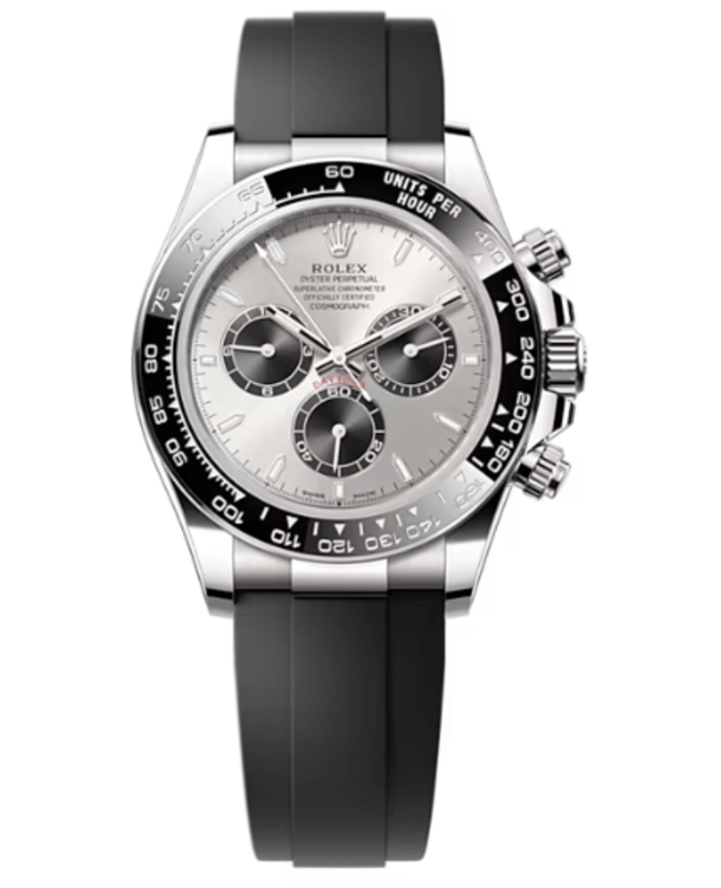 Brand New Authentic Rolex Cosmograph Daytona White Gold Steel and Black Dial Oysterflex Men’s Luxury Watch Model M126519LN-0006. Brushed and Polished 18k White Gold case with Black Oysterflex Band strap. Oysterclasp clasp. Black Monobloc Cerachrom Bezel in Ceramic with Moulded Tachymetric Scale. bezel. Dial description: Luminescent 18k White Gold Hands and Stick Hour Markers with 3 Sub-Dials; 30 Minute at 3 o’clock, 60 Second at 6 o’clock, and 12 Hour at 9 o’clock, Displayed on a Steel and Black dial. Perpetual, Mechanical Chronograph, Self-Winding. movement. Chronograph sub-dials display: 60 Second, 30 Minute, 12 Hours. Powered by Rolex Caliber 4131 engine with 72 hours power reserve. Watch functions: Power Reserve, Hour, Minute, Second, Chronograph, Speed. Screw-Down crown. Scratch Resistant Sapphire crystal. Round case shape. Case size: 40mm. Monobloc Middle Case, Screw-Down Case Back and Winding Crown.. 100 Meters – 330 Feet water resistant. 5-year WatchMaxx warranty. New 2023 Model