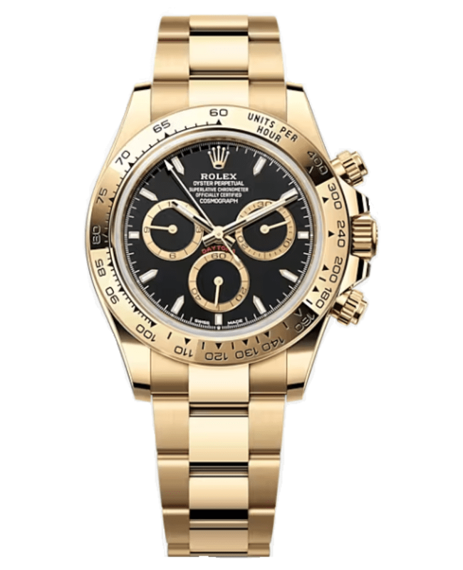 Brand New Authentic Rolex Cosmograph Daytona Yellow Gold Black Dial Men’s Luxury Watch Model M126508-0004. Brushed and Polished Yellow Gold case with Brushed and Polished Yellow Gold Oyster Style Bracelet watch band. Oysterclasp clasp. Fixed, with Engraved Tachymetric Scale, in Yellow Gold. bezel. Dial description: Luminescent 18k Yellow Gold Hands and Stick Hour Markers with 3 Sub-Dials; 30 Minute at 3 o’clock, 60 Second at 6 o’clock, and 12 Hour at 9 o’clock, Displayed on a Black dial. Perpetual, Mechanical Chronograph, Self-Winding. movement. Chronograph sub-dials display: 60 Second, 30 Minute, 12 Hours. Powered by Rolex Caliber 4131 engine with 72 hours power reserve. Watch functions: Power Reserve, Hour, Minute, Second, Chronograph, Speed. Screw-Down crown. Scratch Resistant Sapphire crystal. Round case shape. Case size: 40mm. Monobloc Middle Case, Screw-Down Case Back and Winding Crown.. 100 Meters – 330 Feet water resistant. 5-year WatchMaxx warranty. New 2023 Model
