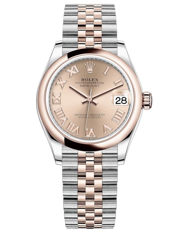 Brand New Authentic Rolex Datejust 31 Rose Roman Dial Women’s Luxury Watch Model M278241-0006. Polished 18kt Everose Gold and Stainless Steel case with 18kt Everose Gold and Stainless Steel Oyster Style Bracelet watch band. Crownclasp clasp. Fixed-Domed bezel. Dial description: Polished Rose Gold Hands With Roman Numeral Hour Markers and the Date Displayed on a Rose dial. Automatic – Chronometer movement. Powered by Rolex Calibre 2236 engine with 55 hours power reserve. Watch functions: Date, Power Reserve, Hour, Minute, Second. Screw in crown. Scratch Resistant Sapphire crystal. Round case shape. Case size: 31mm. Solid case back. 100 Meters – 330 Feet water resistant. 5-year WatchMaxx warranty.