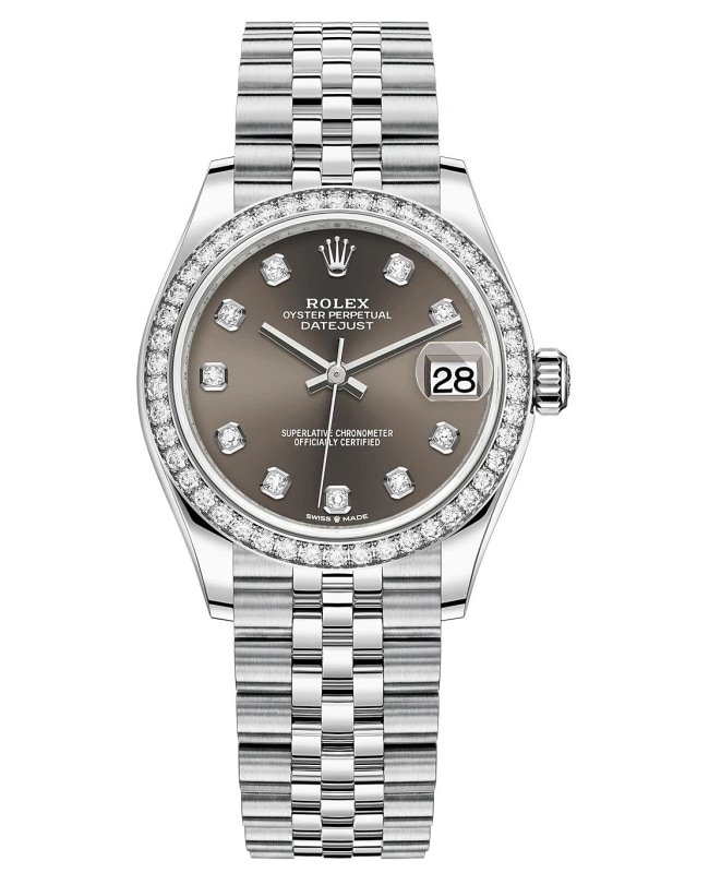 Brand New Authentic Rolex Datejust 31 Stainless Steel and White Gold Dark Grey Diamond Dial Diamond Bezel Women’s Luxury Watch Model M278384RBR-0010. White Rolesor Case (combination of Oystersteel and White Gold) case with White Gold and Stainless Steel Jubilee Style Bracelet watch band. Crownclasp clasp. Fixed Set with Diamonds bezel. Dial description: Polished Silver Hands and Diamond Hour Markers and the Date Displayed on a Dark Grey dial. Automatic movement. 55 hours power reserve. Watch functions: Date, Power Reserve, Hour, Minute, Second. Screw In crown. Scratch Resistant Sapphire crystal. Round case shape. Case size: 31mm. Solid case back. 100 Meters – 330 Feet water resistant. 2-year WatchMaxx warranty.