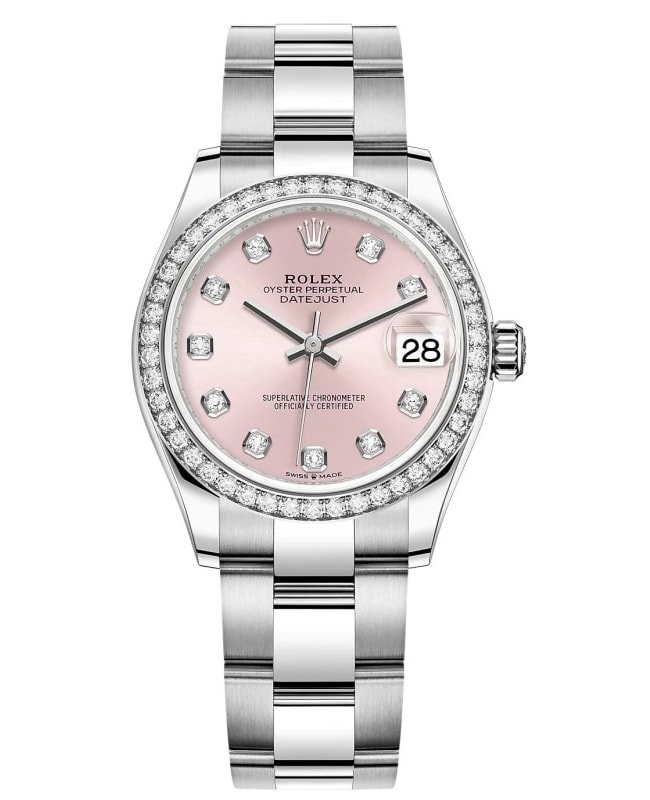 Brand New Authentic Rolex Datejust 31 Stainless Steel and White Gold Pink Diamond Dial Diamond Bezel Women’s Luxury Watch Model M278384RBR-0035. White Rolesor Case (combination of Oystersteel and White Gold) case with White Gold and Stainless Steel Oyster Style Bracelet watch band. Crownclasp clasp. Fixed Set with Diamonds bezel. Dial description: Polished Silver Hands and Diamond Hour Markers and the Date Displayed on a Pink dial. Automatic movement. 55 hours power reserve. Watch functions: Date, Power Reserve, Hour, Minute, Second. Screw In crown. Scratch Resistant Sapphire crystal. Round case shape. Case size: 31mm. Solid case back. 100 Meters – 330 Feet water resistant. 2-year WatchMaxx warranty.