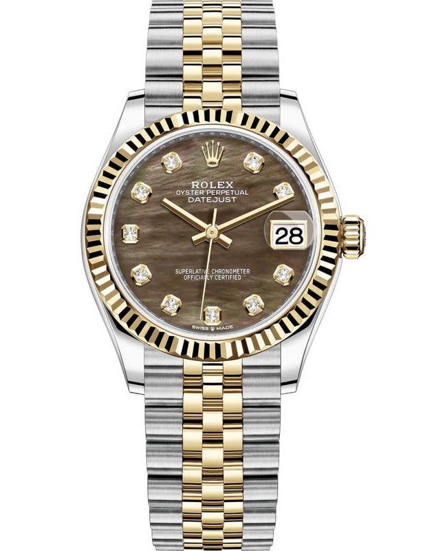 Brand New Authentic Rolex Datejust 31 Stainless Steel and Yellow Gold Black Mother of Pearl Diamond Dial Women’s Luxury Watch Model M278273-0024. Polished Stainless Steel case with Brushed and Polished 18kt Yellow Gold and Stainless Steel Jubilee Style Bracelet watch band. Crownclasp clasp. Fixed-Fluted bezel. Dial description: Yellow Gold Hands and 10 Diamond Hour Markers With the Date at 3 o’clock Position on a Dark Mother of Pearl dial. Automatic – Chronometer movement. Powered by Rolex Calibre 2236 engine with 55 hours power reserve. Watch functions: Date, Power Reserve, Hour, Minute, Second. Screw in crown. Scratch Resistant Sapphire crystal. Round case shape. Case size: 31mm. Solid case back. 100 Meters – 330 Feet water resistant. 5-year WatchMaxx warranty. Also known as model: 278273 Black MOP Diamond Jubilee.