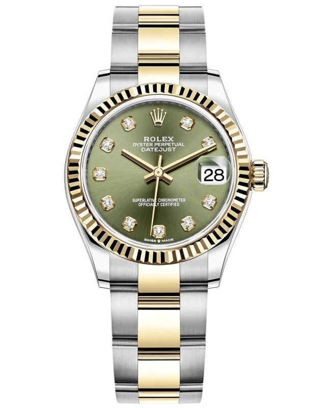 Brand New Authentic Rolex Datejust 31 Stainless Steel and Yellow Gold Olive Green Diamond Dial Women’s Luxury Watch Model M278273-0029. Polished 18kt Yellow Gold and Stainless Steel case with 18kt Yellow Gold and Stainless Steel Oyster Style Bracelet watch band. Oysterclasp clasp. Fixed-Fluted bezel. Dial description: Polished Yellow Gold Hands and Diamond Hour Markers. With the Date Displayed at 3, on an Olive Green dial. Automatic – Chronometer movement. Powered by Rolex Calibre 2236 engine with 55 hours power reserve. Watch functions: Date, Power Reserve, Hour, Minute, Second. Screw in crown. Scratch Resistant Sapphire crystal. Round case shape. Case size: 31mm. Solid case back. 100 Meters – 330 Feet water resistant. 5-year WatchMaxx warranty.