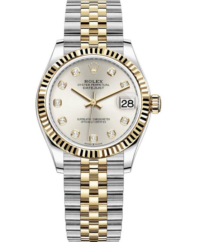 Brand New Authentic Rolex Datejust 31 Stainless Steel and Yellow Gold Silver Diamond Dial Women’s Luxury Watch Model M278273-0020. Polished Stainless Steel case with 18kt Yellow Gold and Stainless Steel Jubilee Style Bracelet watch band. Crownclasp clasp. Fixed bezel. Dial description: Yellow Gold Hands and Diamond Hour Markers With the Date at 3 o’clock Position on a Silver dial. Automatic – Chronometer movement. Powered by Rolex Calibre 2236 engine with 55 hours power reserve. Watch functions: Date, Power Reserve, Hour, Minute, Second. Screw in crown. Scratch Resistant Sapphire crystal. Round case shape. Case size: 31mm. Solid case back. 100 Meters – 330 Feet water resistant. 2-year WatchMaxx warranty. Also known as model: 278273 Silver Diamond Jubilee.