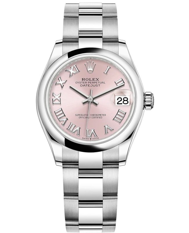Brand New Authentic Rolex Datejust 31 Stainless Steel Pink Roman Dial Women’s Luxury Watch Model M278240-0013. Polished Stainless Steel case with Stainless Steel Oyster Style Bracelet watch band. Crownclasp clasp. Fixed-Domed bezel. Dial description: Polished Silver Hands and Roman Numeral Hour Markers and the Date Displayed on a Pink dial. Automatic – Chronometer movement. Powered by Rolex Calibre 2236 engine with 55 hours power reserve. Watch functions: Date, Power Reserve, Hour, Minute, Second. Screw in crown. Scratch Resistant Sapphire crystal. Round case shape. Case size: 31mm. Solid case back. 100 Meters – 330 Feet water resistant. 5-year WatchMaxx warranty.