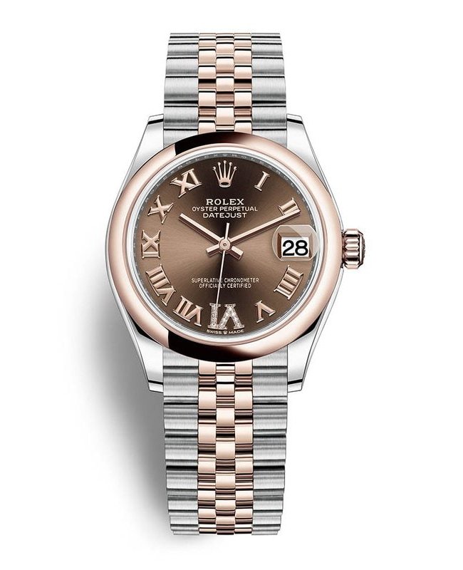 Brand New Authentic Rolex Datejust 31 Steel and 18kt Everose Gold Chocolate Dial Women’s Luxury Watch Model M278241-0004. Polished 18kt Everose Gold and Stainless Steel case with 18kt Everose Gold and Stainless Steel Jubilee Style Bracelet watch band. Crownclasp clasp. Fixed-Domed bezel. Dial description: Polished Rose Gold Hands and Roman Numeral Hours, With a Pave Diamond-set VI Hour Marker and the Date Displayed on a Chocolate dial. Automatic – Chronometer movement. Powered by Rolex Calibre 2236 engine with 55 hours power reserve. Watch functions: Date, Power Reserve, Hour, Minute, Second. Screw in crown. Scratch Resistant Sapphire crystal. Round case shape. Case size: 31mm. Solid case back. 100 Meters – 330 Feet water resistant. 5-year WatchMaxx warranty. Also known as model: 278241 Chocolate Roman VI Jubilee.