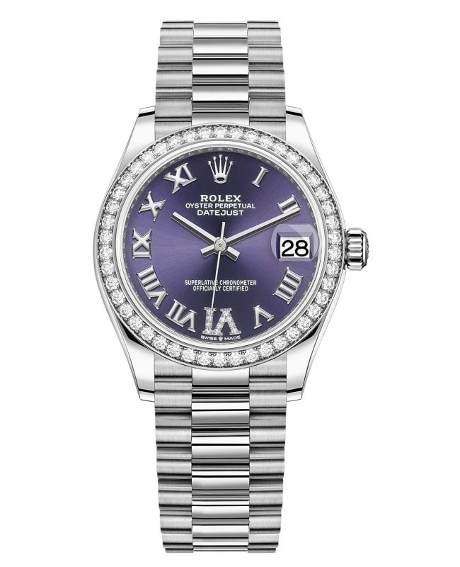 Brand New Authentic Rolex Datejust 31 White Gold Aubergine Diamond Pave Roman Dial Diamond Bezel Women’s Luxury Watch Model M278289RBR-0019. Polished 18kt White Gold case with 18kt White Gold President Style Bracelet watch band. Crownclasp clasp. Fixed- Diamond Set bezel. Dial description: Polished 18kt White Gold Hands and Roman Numeral Hour Markers and a Diamond Pave VI With the Date at 3 o’clock on a Purple dial. Automatic movement. Powered by Rolex Calibre 2236 engine with 55 hours power reserve. Watch functions: Date, Power Reserve, Hour, Minute, Second. Screw Down crown. Scratch Resistant Sapphire crystal. Round case shape. Case size: 31mm. Solid case back. 100 Meters – 330 Feet water resistant. 5-year WatchMaxx warranty.