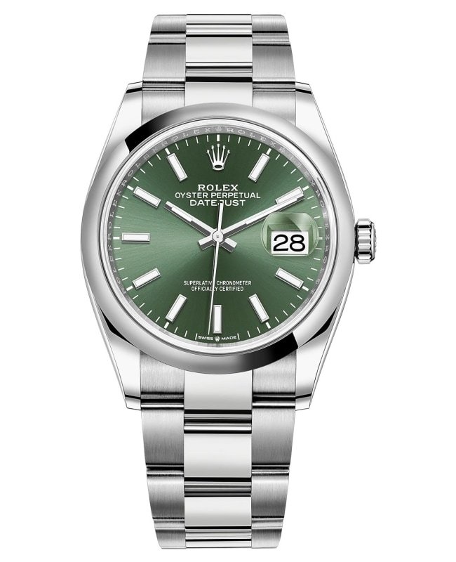 Brand New Authentic Rolex Datejust 36 Stainless Steel Mint Green Dial Women’s Luxury Watch Model M126200-0024. Polished Stainless Steel case with Stainless Steel Oyster Style Bracelet watch band. Oysterclasp clasp. Fixed-Domed bezel. Dial description: Luminescent Hands With Stick Hour Markers, and the Date Displayed at 3, on a Mint Green dial. Automatic – Chronometer movement. Powered by Rolex Calibre 3235 engine with 70 hours power reserve. Watch functions: Date, Power Reserve, Hour, Minute, Second. Screw in crown. Scratch Resistant Sapphire crystal. Round case shape. Case size: 36mm. Solid case back. 100 Meters – 330 Feet water resistant. 5-year WatchMaxx warranty.