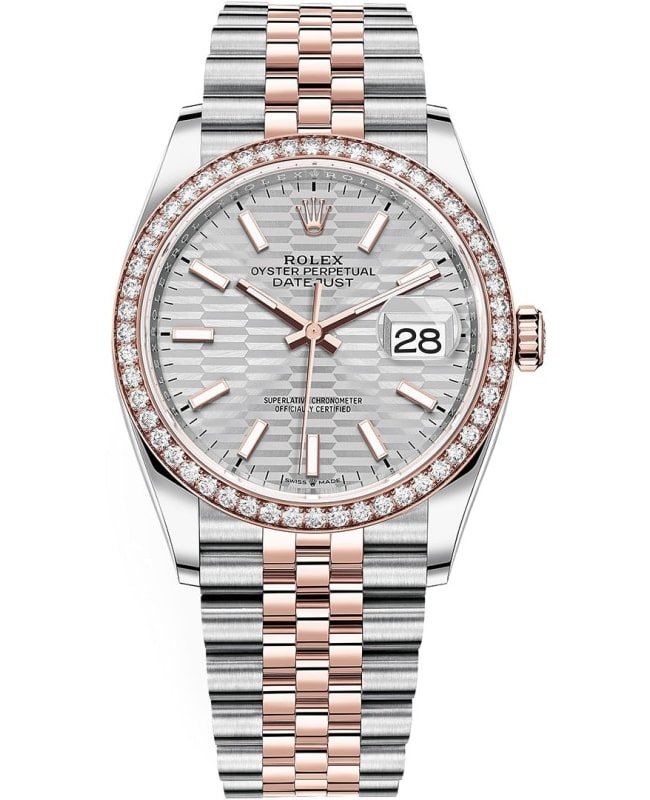 Brand New Authentic Rolex Datejust 36 Steel & Everose Gold Silver Fluted-Motif Dial Diamond Bezel Women’s Luxury Watch Model M126281RBR-0021. Stainless Steel Case and 18kt Everose Gold Diamond-set Bezel case with Stainless Steel and 18kt Everose Gold Jubilee Style Bracelet watch band. Oysterclasp clasp. Fixed- Diamond Set bezel. Dial description: Luminescent Everose Gold Hands and Index Hour Markers, With the Date Displayed at 3, on a Silver Fluted-Motif dial. Automatic – Chronometer movement. Powered by Rolex Calibre 3235 engine with 70 hours power reserve. Watch functions: Date, Power Reserve, Hour, Minute, Second. Screw in crown. Scratch Resistant Sapphire crystal. Round case shape. Case size: 36mm. Solid case back. 100 Meters – 330 Feet water resistant. 2-year WatchMaxx warranty.