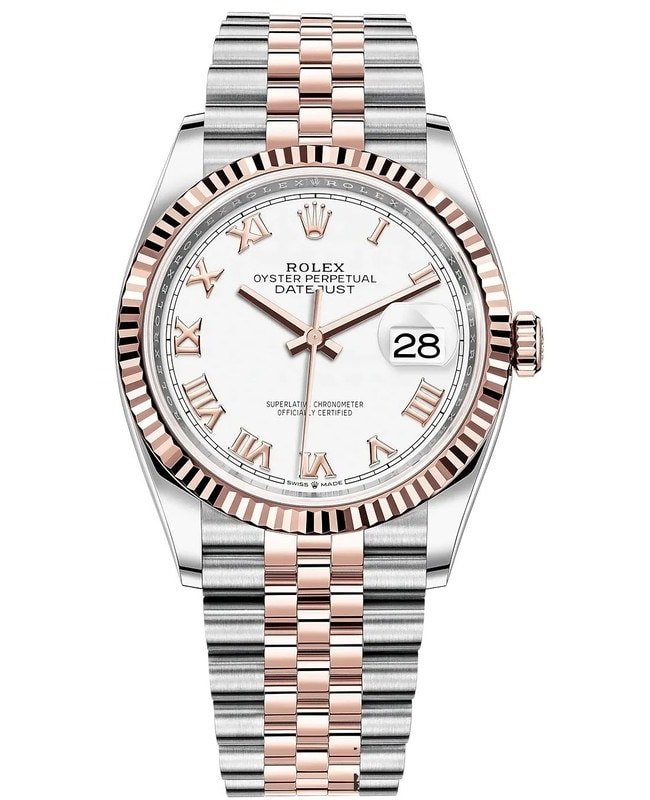 Brand New Authentic Rolex Datejust 36 Steel & Everose Gold White Roman Dial Jubilee Bracelet Women’s Luxury Watch Model M126231-0015. 18kt Rose Gold and Stainless Steel case with 18kt Rose Gold and Stainless Steel Jubilee Bracelet watch band. Oysterclasp clasp. Fixed bezel. Dial description: Luminescent Rose Gold Hands and Roman Numeral Hour Markers with the Date Displayed at 3, on a White dial. Automatic – Chronometer movement. Powered by Rolex Calibre 3235 engine with 70 hours power reserve. Watch functions: Date, Power Reserve, Hour, Minute, Second. Screw in crown. Scratch Resistant Sapphire crystal. Round case shape. Case size: 36mm. Solid case back. 100 Meters – 330 Feet water resistant. 2-year WatchMaxx warranty. Also known as model: 126231 White Roman Jubilee.