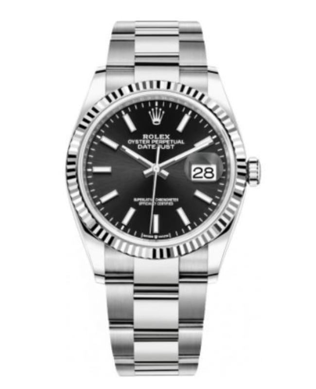Brand New Authentic Rolex Datejust 36 Steel & White Gold Black Dial Women’s Luxury Watch Model M126234-0016. Polished White Gold and Stainless Steel case with White Gold and Stainless Steel Oyster Style Bracelet watch band. Oysterclasp clasp. Fixed-Fluted bezel. Dial description: Luminescent White Gold Hands and Index Hour Markers With the Date Displayed at 3, on a Black dial. Automatic Self Winding movement. Powered by Rolex Calibre 3235 engine with 70 hours power reserve. Watch functions: Date, Power Reserve, Hour, Minute, Second. Screw in crown. Scratch Resistant Sapphire crystal. Round case shape. Case size: 36mm. Case thickness: 11.60mm. Solid case back. 100 Meters – 330 Feet water resistant. 2-year WatchMaxx warranty. Also known as model: 126234 Black Index Oyster.