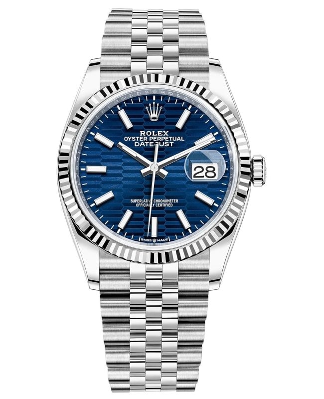 Brand New Authentic Rolex Datejust 36 Steel & White Gold Blue Fluted-Motif Dial Women’s Luxury Watch Model M126234-0049. Polished White Gold and Stainless Steel case with White Gold and Stainless Steel Jubilee Style Bracelet watch band. Oysterclasp clasp. Fixed-Fluted bezel. Dial description: Luminescent White Gold Hands and Stick Hour Markers, With Minute Markers Around the Outer Rim on a Blue Fluted-Motif dial. Automatic Self Winding movement. Powered by Rolex Calibre 3235 engine with 70 hours power reserve. Watch functions: Date, Hour, Minute, Second. Screw Down crown. Scratch Resistant Sapphire crystal. Round case shape. Case size: 36mm. Solid case back. 100 Meters – 330 Feet water resistant. 5-year WatchMaxx warranty.