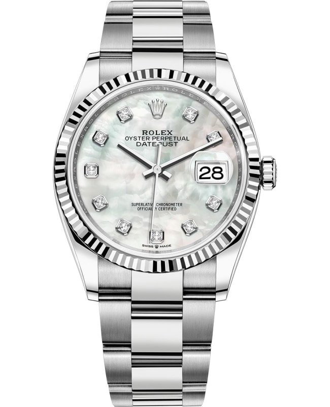 Brand New Authentic Rolex Datejust 36 Steel & White Gold Mother-of-Pearl Diamond Dial Women’s Luxury Watch Model M126234-0020. Polished White Gold and Stainless Steel case with White Gold and Stainless Steel Oyster Style Bracelet watch band. Oysterclasp clasp. Fixed-Fluted bezel. Dial description: Polished White Gold Hands and Diamond Hour Markers, With Minute Markers Around the Outer Rim on a Mother-of-Pearl dial. Automatic-Chronometer movement. Powered by Rolex Calibre 3235 engine with 70 hours power reserve. Watch functions: Date, Hour, Minute, Second. Screw Down crown. Scratch Resistant Sapphire crystal. Round case shape. Case size: 36mm. Solid case back. 100 Meters – 330 Feet water resistant. 5-year WatchMaxx warranty.
