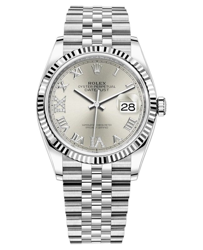 Brand New Authentic Rolex Datejust 36 Steel & White Gold Silver Diamond Pave Roman Dial Women’s Luxury Watch Model M126234-0029. Polished White Gold and Stainless Steel case with White Gold and Stainless Steel Jubilee Style Bracelet watch band. Oysterclasp clasp. Fixed-Fluted 18kt White Gold bezel. Dial description: Polished 18kt White Gold Hands and Roman Numeral Hour Markers. Pave Diamond set VI and IX Hour Markers and the Date Displayed at 3, on a Silver dial. Automatic – Chronometer movement. Powered by Rolex Calibre 3235 engine with 70 hours power reserve. Watch functions: Date, Power Reserve, Hour, Minute, Second. Screw Down crown. Scratch Resistant Sapphire crystal. Round case shape. Case size: 36mm. Case thickness: 11.60mm. Solid case back. 100 Meters – 330 Feet water resistant. 5-year WatchMaxx warranty.