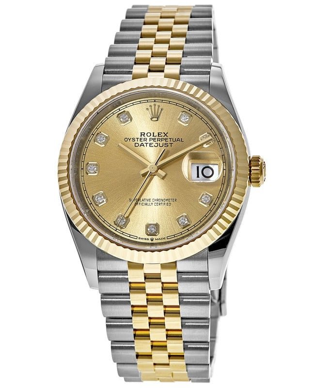 Brand New Authentic Rolex Datejust 36 Steel & Yellow Gold Champagne Diamond Dial Women’s Luxury Watch Model M126233-0017. Polished 18kt Yellow Gold and Stainless Steel case with Stainless Steel and Yellow Gold Oyster Style watch band. Oysterclasp clasp. Fixed-Fluted bezel. Dial description: Polished Yellow Gold Hands and Diamond Hour Markers With the Date Displayed at 3, on a Champagne dial. Automatic – Chronometer movement. Powered by Rolex Calibre 3235 engine with 70 hours power reserve. Watch functions: Date, Power Reserve, Hour, Minute, Second. Screw in crown. Scratch Resistant Sapphire crystal. Round case shape. Case size: 36mm. Solid case back. 100 Meters – 330 Feet water resistant. 5-year WatchMaxx warranty. Also known as model: M1262330017.