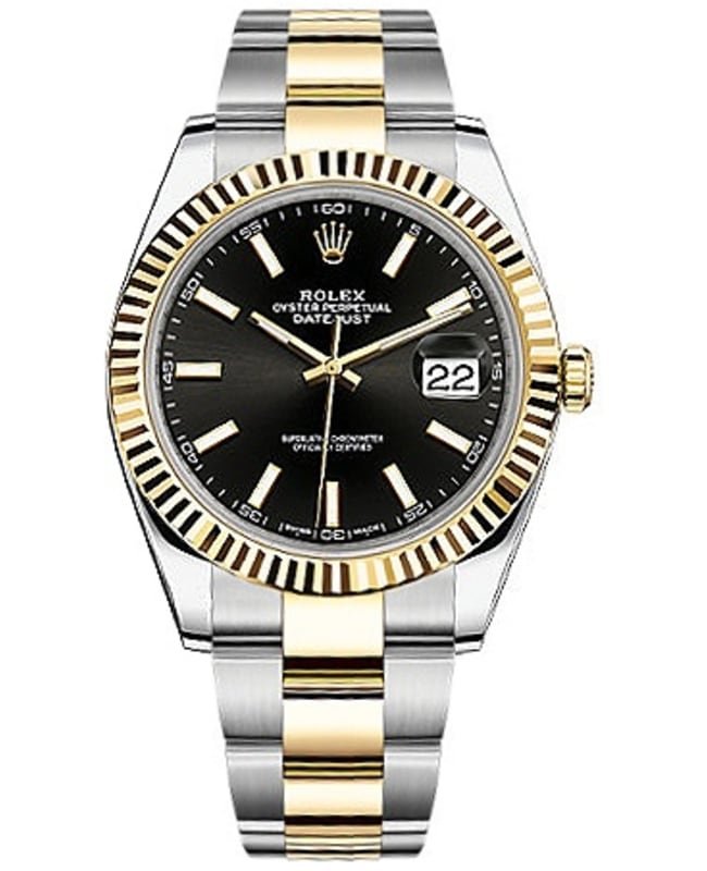 Brand New Authentic Rolex Datejust 41 Black Dial Men’s Luxury Watch Model M126333-0013. Stainless Steel with 18kt Yellow Gold case with Stainless Steel and 18kt Yellow Gold oyster style watch band. Oysterclasp clasp. Fluted bezel. Dial description: Yellow Gold Hands And Index Hour Markers on Black dial. Automatic – Chronometer movement. Powered by Rolex Calibre 3235 engine with 70 hours power reserve. Watch functions: Date, Power Reserve, Hour, Minute, Second. Screw Down crown. Scratch Resistant Sapphire crystal. Case size: 41mm. Solid case back. 100 Meters – 330 Feet water resistant. 5-year WatchMaxx warranty.