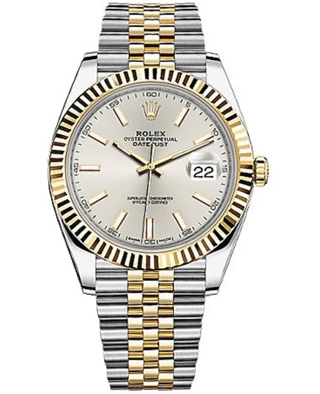 Brand New Authentic Rolex Datejust 41 Silver Dial Jubilee Men’s Watch Model M126333-0002. Stainless Steel with 18kt Yellow Gold case with Stainless Steel and 18kt Yellow Gold Jubilee style watch band. Crownclasp clasp. Fluted bezel. Dial description: Yellow gold-tone Luminous hands and index hour markers on Silver dial. Automatic – Chronometer movement. Powered by Rolex Calibre 3235 engine with 70 hours power reserve. Watch functions: Date, Power Reserve, Hour, Minute, Second. Screw Down crown. Scratch Resistant Sapphire crystal. Case size: 41mm. Solid case back. 100 Meters – 330 Feet water resistant. 5-year WatchMaxx warranty.