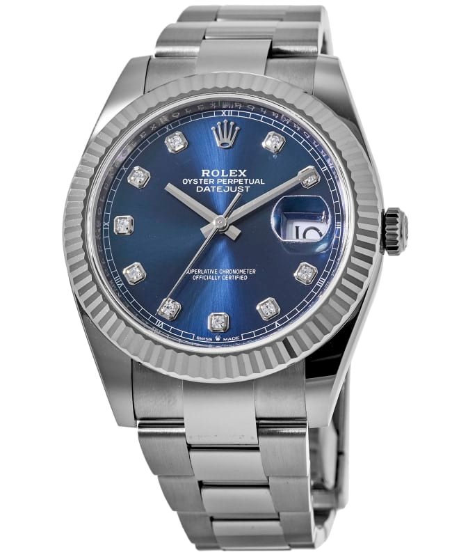 Brand New Authentic Rolex Datejust 41 Stainless Steel Blue Diamond Dial Men’s Luxury Watch Model M126334-0015. Stainless Steel case with Stainless Steel Oyster Style Bracelet watch band. Oysterclasp clasp. Fixed-Fluted 18kt White Gold bezel. Dial description: Silver Hands and Diamond Hour Markers with the Date Displayed at 3, on Blue dial. Automatic – Chronometer movement. Powered by Rolex Calibre 3235 engine with 70 hours power reserve. Watch functions: Date, Power Reserve, Hour, Minute, Second. Screw down crown. Scratch Resistant Sapphire crystal. Round case shape. Case size: 41mm. Solid case back. 100 Meters – 330 Feet water resistant. 5-year WatchMaxx warranty. Also known as model: 126334 Blue Diamond Oyster.