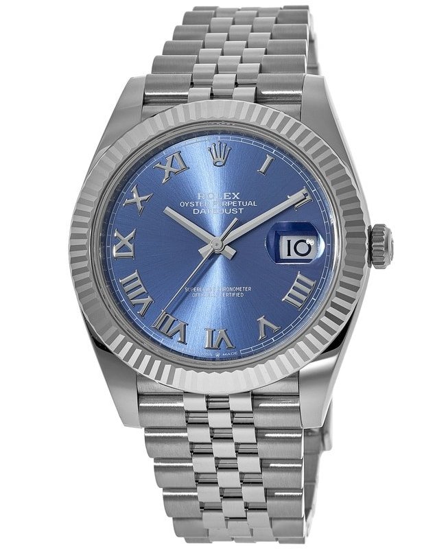 Brand New Authentic Rolex Datejust 41 Steel & White Gold Blue Roman Dial Fluted Bezel Jubilee Band Men’s Luxury Watch Model M126334-0026. Polished Stainless Steel Case With a 18kt White Gold Fluted Bezel case with Stainless Steel Jubilee Style Bracelet watch band. Oysterclasp clasp. Fixed-Fluted bezel. Dial description: Polished White Gold Hands and Roman Numeral Hour Markers, With the Date Displayed at 3, on a Blue Roman dial. Automatic – Chronometer movement. Powered by Rolex Calibre 3235 engine with 70 hours power reserve. Watch functions: Date, Power Reserve, Hour, Minute, Second. Screw in crown. Scratch Resistant Sapphire crystal. Round case shape. Case size: 41mm. Solid case back. 100 Meters – 330 Feet water resistant. 5-year WatchMaxx warranty. Also known as model: 126334 blue roman.
