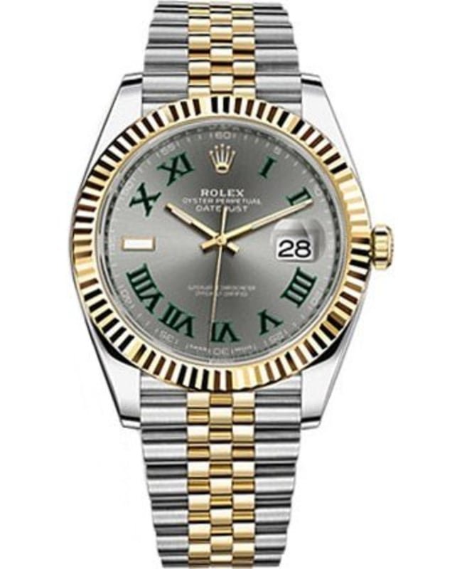 Brand New Authentic Rolex Datejust 41 Steel & Yellow Gold Slate Grey Dial Men’s Luxury Watch Model M126333-0020. Polished Stainless Steel Case With a 18kt Yellow Gold Fluted Bezel case with Stainless Steel and 18kt Yellow Gold Jubilee Style Bracelet watch band. Oysterclasp clasp. Fixed-Fluted bezel. Dial description: Luminescent Yellow Gold Hands and Green Roman Numeral Hour Markers, With the Date Displayed at 3, on a Slate Grey dial. Automatic – Chronometer movement. Powered by Rolex Calibre 3235 engine with 70 hours power reserve. Watch functions: Date, Power Reserve, Hour, Minute, Second. Screw in crown. Scratch Resistant Sapphire crystal. Round case shape. Case size: 41mm. Solid case back. 100 Meters – 330 Feet water resistant. 5-year WatchMaxx warranty. Also known as model: 126333 Slate Roman Jubilee.