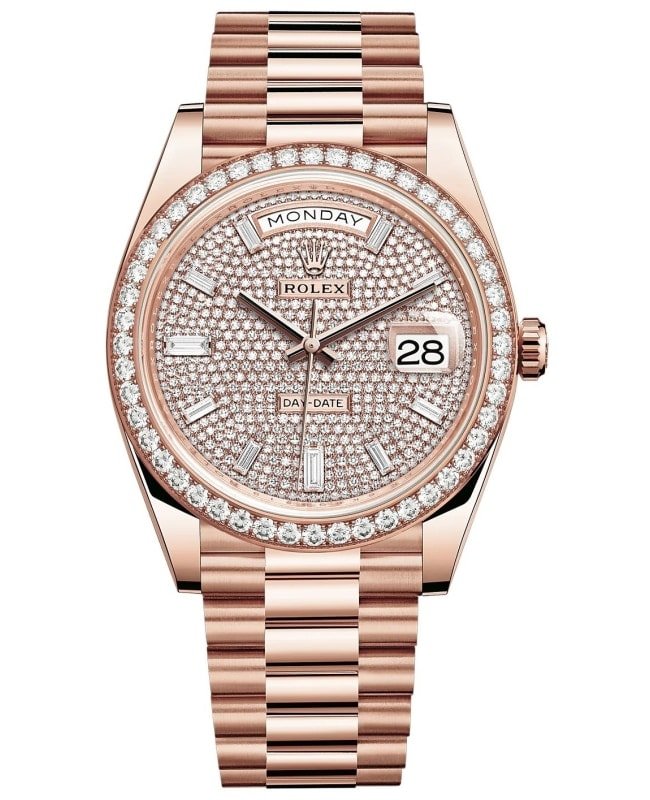 Brand New Authentic Rolex Day-Date 40 18K Everose Gold Diamond-Paved Dial Diamond Bezel Men’s Luxury Watch Model M228345RBR-0002. 18k Everose gold and diamonds case with 18K Everose Gold President style watch band. Crownclasp clasp. Fixed Diamond bezel. Dial description: Rose Gold Hands And Baguette-cut diamonds with day of week at 12 o’clock position and day of month at 3 o’clock position on a pave diamond dial. Automatic – Chronometer movement. Powered by Rolex Calibre 3255 engine with 70 hours power reserve. Watch functions: Date, Power Reserve, Hour, Minute, Second. Screw down crown. Scratch Resistant Sapphire crystal. Case size: 40mm. Solid case back. 100 Meters – 330 Feet water resistant. 5-year WatchMaxx warranty.