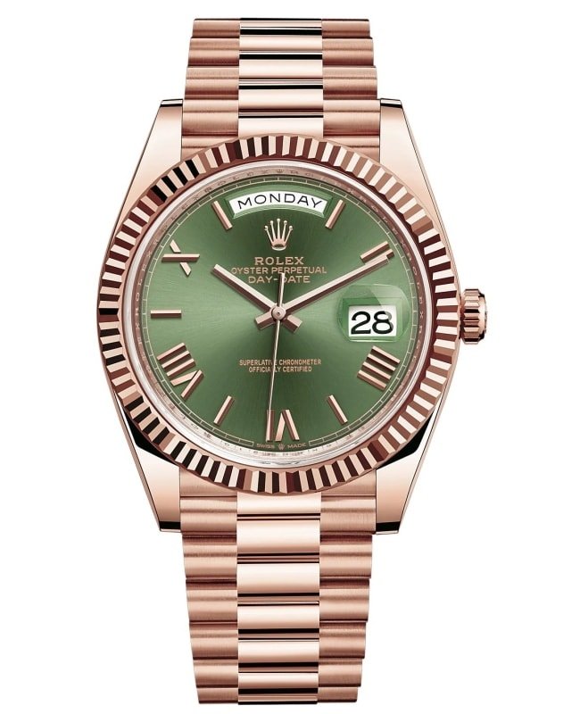 Brand New Authentic Rolex Day-Date 40 18k Everose Gold Olive Green Dial 60th Anniversary Men’s Luxury Watch Model M228235-0025. Rose Gold Rose Gold Brushed and Polished watch band. Crownclasp clasp. Fixed-Fluted bezel. Dial description: Rose Gold hands and Roman numeral/index hour markers with day of week at 12 o’clock and day of month at 3 o’clock on olive green dial. Automatic – Chronometer movement. Powered by Rolex Calibre 3255 engine with 70 hours power reserve. Watch functions: Date, Power Reserve, Hour, Minute, Second. Screw down crown. Scratch Resistant Sapphire crystal. Case size: 40mm. Solid case back. 100 Meters – 330 Feet water resistant. 5-year WatchMaxx warranty.