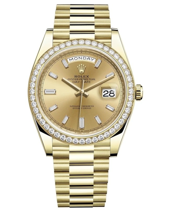 Brand New Authentic Rolex Day-Date 40 18K Yellow Gold Champagne Diamond Dial Diamond Bezel Men’s Watch Model M228348RBR-0002. Yellow Gold Yellow Gold Brushed and Polished watch band. Crownclasp clasp. Fixed Diamond bezel. Dial description: Yellow gold hands and Baguette-cut hour markers with day of week at 12 o’clock position and day of month at 3 o’clock position on Champagne dial. Automatic – Chronometer movement. Powered by Rolex Calibre 3255 engine with 70 hours power reserve. Watch functions: Date, Power Reserve, Hour, Minute, Second. Screw down crown. Scratch Resistant Sapphire crystal. Case size: 40mm. Solid case back. 100 Meters – 330 Feet water resistant. 5-year WatchMaxx warranty.