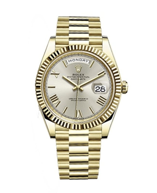 Brand New Authentic Rolex Day-Date 40 18K Yellow Gold Silver Roman Dial Men’s Luxury Watch Model M228238-0002. Polished 18kt Yellow Gold case with 18K Gold President Style watch band. Crownclasp clasp. Fixed-Fluted bezel. Dial description: Yellow Gold Hands and Roman Numeral Hour Markers, with the Day and Date Displayed at 3, on a Silver dial. Automatic movement. Powered by Rolex Calibre 3255 engine with 70 hours power reserve. Watch functions: Date, Power Reserve, Hour, Minute, Second, Day. Screw in crown. Scratch Resistant Sapphire crystal. Round case shape. Case size: 40mm. Solid case back. 100 Meters – 330 Feet water resistant. 5-year WatchMaxx warranty. Also known as model: 228238 Silver Roman.