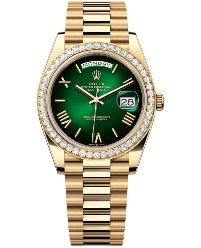 Brand New Authentic Rolex Day-Date 40 Automatic Green Dial Diamond Bezel 18K Yellow Gold President Bracelet Men’s Luxury Watch Model M228348RBR-0045. Polished 18K Yellow Gold case with Brushed and Polished 18k Yellow Gold President Bracelet watch band. 18K Yellow Gold Crownclasp clasp. Fixed with Diamonds bezel. Dial description: Polished Yellow Gold Hands with Roman Numeral & Stick Hour Markers and the Day of the Week in the 12 o’clock and the Date at 3 o’clock on a Green dial. Swiss Automatic. Chronometer movement. Chronograph sub-dials display: Day of the Week. Calendar: Day Of The Week In The 12 O’clock Position And Date At 3 O’clock. Powered by Calibre 3255 engine with 70 hours power reserve. Watch functions: Day, Date, Hour, Minute, Second, Power Reserve. Screw Down crown. Scratch Resistant Sapphire crystal. Round case shape. Case size: 40mm. Solid case back. 100 Meters – 330 Feet water resistant. 5-year WatchMaxx warranty. Also known as model: M228348RBR0045.