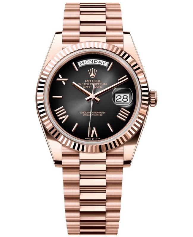 Brand New Authentic Rolex Day-Date 40 Automatic Grey Dial 18k Rose Gold President Bracelet Men’s Luxury Watch Model M228235-0055. Polished 18K Rose Gold case with Brushed and Polished 18K Rose Gold President Bracelet watch band. 18K Rose Gold Crownclasp clasp. Fluted bezel. Dial description: Polished Rose Gold Hands with Roman Numeral & Stick Hour Markers and the Day of the Week in the 12 o’clock and the Date at 3 o’clock on a Grey dial. Swiss Automatic. Chronometer movement. Chronograph sub-dials display: Day of the Week. Calendar: Day Of The Week In The 12 O’clock Position And Date At 3 O’clock. Powered by Calibre 3255 engine with 70 hours power reserve. Watch functions: Power Reserve, Hour, Minute, Second, Day, Date. Screw Down crown. Scratch Resistant Sapphire crystal. Round case shape. Case size: 40mm. Solid case back. 100 Meters – 330 Feet water resistant. 5-year WatchMaxx warranty. Also known as model: M2282350055.