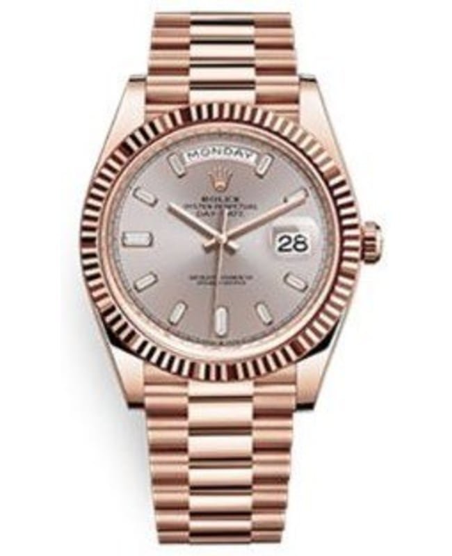 Brand New Authentic Rolex Day-Date 40 Everose Gold Sundust Diamond Dial Men’s Watch Model M228235-0004. Polished 18Kt Everose Gold case with 18K Everose Gold President style watch band. Crownclasp clasp. Fixed-Fluted bezel. Dial description: Rose Gold Hands and Baguette-Cut Diamond Hour Markers With day of Week at 12 o’clock Position and day of Month at 3 o’clock Position on a Sundust dial. Automatic movement. Powered by Rolex Calibre 3255 engine with 70 hours power reserve. Watch functions: Date, Power Reserve, Hour, Minute, Second, Day. Screw down crown. Scratch Resistant Sapphire crystal. Round case shape. Case size: 40mm. Solid case back. 100 Meters – 330 Feet water resistant. 5-year WatchMaxx warranty. Also known as model: 228235 Sundust Baguette Index.