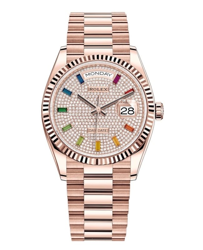 Brand New Authentic Rolex Day-Date Rose Gold Diamond Paved Gemstone Dial Women’s Luxury Watch Model M128235-0039. 18kt Everose Gold case with 18kt Everose Gold Diamond-set President watch band. Crownclasp clasp. Fixed-Fluted bezel. Dial description: Rose Gold Hands and Gemstone Set Hour Markers with the Date Displayed at 3, on Diamond Paved dial. Automatic – Chronometer movement. Powered by Rolex Calibre 3255 engine with 70 hours power reserve. Watch functions: Date, Power Reserve, Hour, Minute, Second. Screw in crown. Scratch Resistant Sapphire crystal. Round case shape. Case size: 36mm. Solid case back. 100 Meters – 330 Feet water resistant. 5-year WatchMaxx warranty.