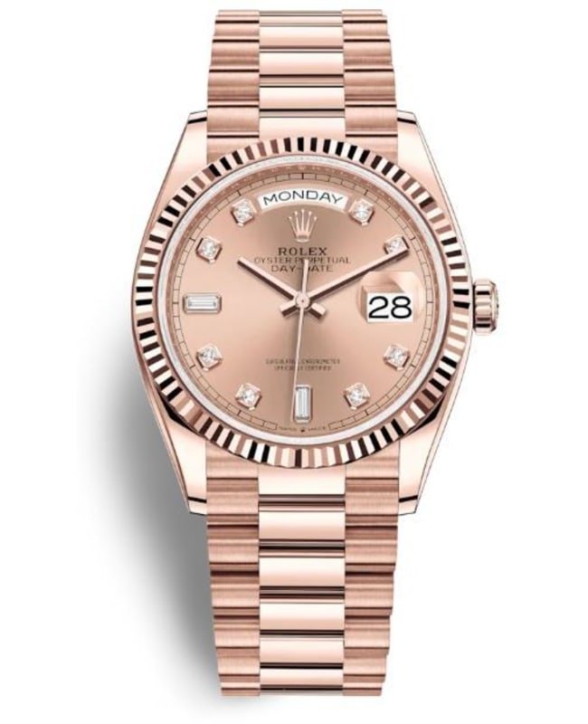 Brand New Authentic Rolex Day-Date Rose Gold Pink Diamond Dial Women’s Luxury Watch Model M128235-0009. 18kt Everose Gold case with 18K Everose Gold President style watch band. Crownclasp clasp. Fixed-Fluted bezel. Dial description: Rose Gold Hands and Diamond Hour Markers with the Date Displayed at 3, on a Rose dial. Automatic movement. Powered by Rolex Calibre 3255 engine with 70 hours power reserve. Watch functions: Date, Power Reserve, Hour, Minute, Second. Screw in crown. Scratch Resistant Sapphire crystal. Round case shape. Case size: 36mm. Solid case back. 100 Meters – 330 Feet water resistant. 5-year WatchMaxx warranty. Also known as model: 128235PDP.