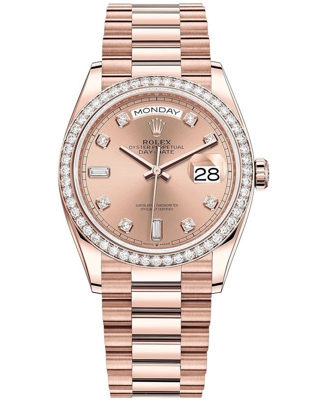 Brand New Authentic Rolex Day-Date Rose Gold Rose Diamond Dial Diamond Bezel Women’s Luxury Watch Model M128345RBR-0009. 18kt Rose Gold case with Brushed and Polished 18kt Rose Gold President Style watch band. Crownclasp clasp. Fixed- Diamond Set bezel. Dial description: Polished Rose Gold Hands and Diamond Hour Markers With the Day and Date Displayed, on a Rose dial. Automatic movement. Powered by Rolex Calibre 3255 engine with 70 hours power reserve. Watch functions: Date, Power Reserve, Hour, Minute, Second, Day. Screw Down crown. Scratch Resistant Sapphire crystal. Round case shape. Case size: 36mm. Solid case back. 100 Meters – 330 Feet water resistant. 5-year WatchMaxx warranty. Also known as model: 128345RBR-0009, M128345RBR0009.