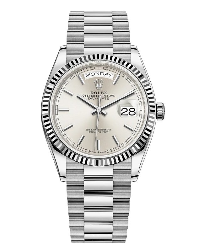 Brand New Authentic Rolex Day-Date White Gold Silver Dial Women’s Luxury Watch Model M128239-0005. Polished 18kt White Gold case with Brushed and Polished 18kt White Gold President Style Bracelet watch band. Crownclasp clasp. Fixed-Fluted bezel. Dial description: Polished White Gold Hands and Stick Hour Markers With the Day and Date Displayed, on a Silver dial. Automatic movement. Powered by Rolex Calibre 3255 engine with 70 hours power reserve. Watch functions: Date, Power Reserve, Hour, Minute, Second, Day. Screw in crown. Scratch Resistant Sapphire crystal. Round case shape. Case size: 36mm. Solid case back. 100 Meters – 330 Feet water resistant. 5-year WatchMaxx warranty.