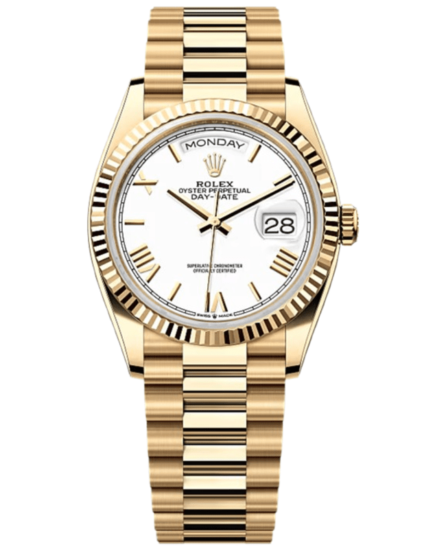 Brand New Authentic Rolex Day-Date Yellow Gold 36 Automatic White Dial Women’s Luxury Watch Model M128238-0113. Polished 18K Yellow Gold case with Brushed and Polished 18K Yellow Gold President Style Bracelet watch band. 18K Yellow Gold Crownclasp clasp. Fixed-Fluted bezel. Dial description: Polished Yellow Gold Hands and Stick/Roman Numeral Hour Markers, the Day at 12 o’clock and the Date at 3 on a White dial. Swiss Automatic. Chronometer movement. Chronograph sub-dials display: Date, Day of the Week. Calendar: Day Of The Week In The 12 O’clock Position And Date At 3 O’clock. Powered by Rolex Calibre 3255 engine with 70 hours power reserve. Watch functions: Date, Power Reserve, Hour, Minute, Second, Day. Screw Down crown. Scratch Resistant Sapphire crystal. Unique case shape. Case size: 36mm. Solid case back. 100 Meters – 330 Feet water resistant. 5-year WatchMaxx warranty. Also known as model: M1282380113.