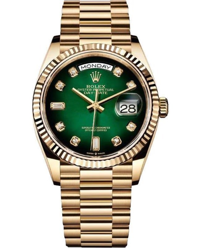 Brand New Authentic Rolex Day-Date Yellow Gold Green Diamond Dial Women’s Luxury Watch Model M128238-0069. Polished 18kt Yellow Gold case with Brushed and Polished 18kt Yellow Gold President Style Bracelet watch band. Crownclasp clasp. Fixed-Fluted bezel. Dial description: Polished Yellow Gold Hands and Diamond Hour Markers With the Day and Date Displayed, on a Graduated Green dial. Automatic movement. Powered by Rolex Calibre 3255 engine with 70 hours power reserve. Watch functions: Date, Power Reserve, Hour, Minute, Second, Day. Screw in crown. Scratch Resistant Sapphire crystal. Round case shape. Case size: 36mm. Solid case back. 100 Meters – 330 Feet water resistant. 5-year WatchMaxx warranty. Also known as model: 128238 Green Graduated Diamond.