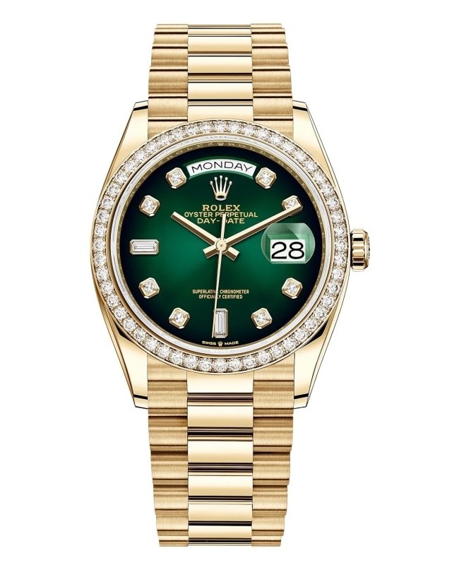 Brand New Authentic Rolex Day-Date Yellow Gold Green Ombre Diamond Dial Diamond Bezel Women’s Luxury Watch Model M128348RBR-0035. Polished 18kt Yellow Gold case with Brushed and Polished 18kt Yellow Gold President Style Bracelet watch band. Crownclasp clasp. Fixed- Diamond Set bezel. Dial description: Polished Yellow Gold Hands and Diamond Hour Markers With the Day and Date Displayed, on a Green Ombre dial. Automatic movement. Powered by Rolex Calibre 3255 engine with 70 hours power reserve. Watch functions: Date, Power Reserve, Hour, Minute, Second, Day. Screw Down crown. Scratch Resistant Sapphire crystal. Round case shape. Case size: 36mm. Solid case back. 100 Meters – 330 Feet water resistant. 5-year WatchMaxx warranty.