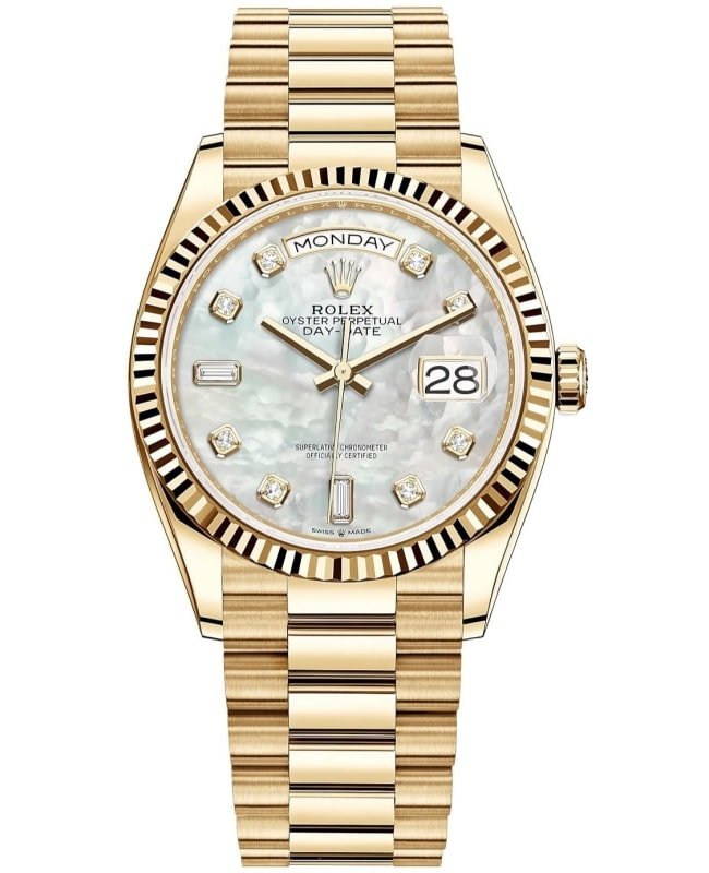 Brand New Authentic Rolex Day-Date Yellow Gold Mother of Pearl Diamond Dial Women’s Luxury Watch Model M128238-0011. Polished 18kt Yellow Gold case with Brushed and Polished 18kt Yellow Gold President Style Bracelet watch band. Crownclasp clasp. Fixed-Fluted bezel. Dial description: Polished Yellow Gold Hands and Diamond Hour Markers With the Day and Date Displayed, on a Mother of Pearl dial. Automatic movement. Powered by Rolex Calibre 3255 engine with 70 hours power reserve. Watch functions: Date, Power Reserve, Hour, Minute, Second, Day. Screw in crown. Scratch Resistant Sapphire crystal. Round case shape. Case size: 36mm. Solid case back. 100 Meters – 330 Feet water resistant. 5-year WatchMaxx warranty.