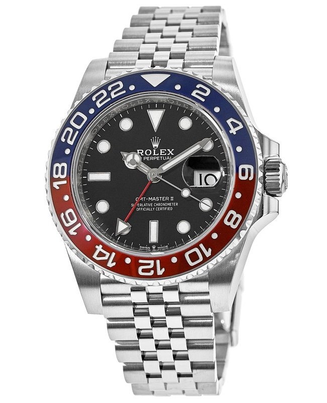 Brand New Authentic Rolex GMT Master ll Pepsi Bezel Jubilee Bracelet Men’s Luxury Watch Model M126710BLRO-0001. Stainless Steel case with Brushed and Polished Jubilee Stainless Steel watch band. Oysterclasp clasp. Bi-Directional Rotating bezel. Dial description: Silver tone luminous hands and Circle/Index hour markers with minute markers around the outer rim on a Black dial. Automatic – Chronometer movement. Powered by Rolex Calibre 3285 engine with 70 hours power reserve. Watch functions: Date, 24 Hour, Power Reserve, Hour, Minute, Second, GMT. Screw Down crown. Scratch Resistant Sapphire crystal. Round case shape. Case size: 40mm. Solid case back. 100 Meters – 330 Feet water resistant. 5-year WatchMaxx warranty. Also known as model: 126710BLRO-0001, M126710BLRO-0001.