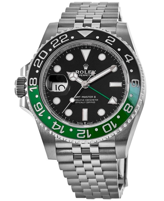 Brand New Authentic Rolex GMT Master ll Sprite Lefty Jubilee Bracelet Men’s Luxury Watch Model M126720VTNR-0002. Brushed and Polished Stainless Steel case with Brushed and Polished Stainless Steel Jubilee Style Bracelet watch band. Oysterclasp clasp. Bi-Directional Rotating bezel. Dial description: Luminescent White Gold Hands and Index Hour Markers With the Date Displayed at 9, on a Black dial. Automatic – Chronometer movement. Chronograph sub-dials display: Date. Calendar: Date at 9 o’clock. Powered by Rolex Calibre 3285 engine with 70 hours power reserve. Watch functions: Date, 24 Hour, Power Reserve, Hour, Minute, Second, GMT. Screw in crown. Scratch Resistant Sapphire crystal. Round case shape. Case size: 40mm. Solid case back. 100 Meters – 330 Feet water resistant. 2-year WatchMaxx warranty.