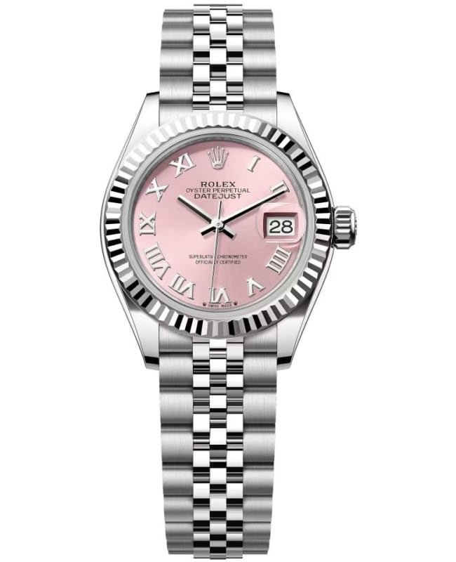 Brand New Authentic Rolex Lady-Datejust 28 Stainless Steel and White Gold Automatic Pink Dial Women’s Luxury Watch Model M279174-0017. Brushed and Polished 18K White Gold & Stainless Steel case with Brushed and Polished Stainless Steel Jubilee Bracelet watch band. Brushed and Polished Stainless Steel Crownclasp clasp. Fluted bezel. Dial description: Polished Silver Tone Hands and Roman Numeral Hour Markers and the Date at 3 o’clock on a Pink dial. Swiss Automatic movement. Powered by Calibre 2236 engine with 55 hours power reserve. Watch functions: Date, Hour, Minute, Second, Power Reserve. Screw Down crown. Scratch Resistant Sapphire crystal. Round case shape. Case size: 28mm. Solid case back. 100 Meters – 330 Feet water resistant. 5-year WatchMaxx warranty. Also known as model: M2791740017.