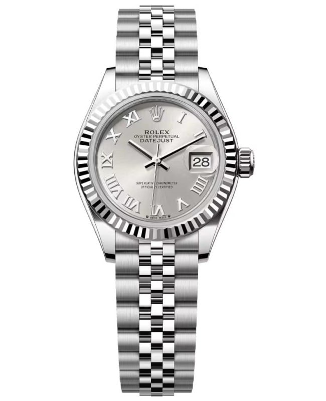 Brand New Authentic Rolex Lady-Datejust 28 Stainless Steel and White Gold Automatic Silver Dial Women’s Luxury Watch Model M279174-0007. Brushed and Polished 18K White Gold & Stainless Steel case with Brushed and Polished Stainless Steel Jubilee Bracelet watch band. Brushed and Polished Stainless Steel Crownclasp clasp. Fluted bezel. Dial description: Polished Silver Tone Hands and Roman Numeral Hour Markers and the Date at 3 o’clock on a Silver dial. Swiss Automatic movement. Powered by Calibre 2236 engine with 55 hours power reserve. Watch functions: Date, Hour, Minute, Second, Power Reserve. Screw Down crown. Scratch Resistant Sapphire crystal. Round case shape. Case size: 28mm. Solid case back. 100 Meters – 330 Feet water resistant. 5-year WatchMaxx warranty. Also known as model: M2791740007.