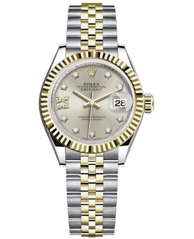 Brand New Authentic Rolex Lady-Datejust 28 Stainless Steel and Yellow Gold Silver Star Diamond Dial Women’s Dress Watch Model M279173-0003. Polished 18kt Yellow Gold and Stainless Steel case with Stainless Steel and 18kt Yellow Gold Jubilee Style Bracelet watch band. Crownclasp clasp. Fixed- Fluted bezel. Dial description: Yellow Gold Hands and Star Setting Diamond Hour Markers, With the Date Displayed at 3, on a Silver dial. Automatic – Chronometer movement. Powered by Rolex Calibre 2236 engine with 55 hours power reserve. Watch functions: Date, Power Reserve, Hour, Minute, Second. Screw In crown. Scratch Resistant Sapphire crystal. Round case shape. Case size: 28mm. Solid case back. 100 Meters – 330 Feet water resistant. 5-year WatchMaxx warranty. This Lady-Datejust 28 Stainless Steel and Yellow Gold Silver Star Diamond Dial watch from Rolex radiates elegance. It features a polished 18k yellow gold and stainless steel case with an accompanying Jubilee style bracelet band crafted of both gold and stainless steel. The fixed fluted bezel is a dazzling circle of golden angles, while the silver dial is marked by luminous yellow gold hands and star setting diamond hour markers – including the date display at 3 o’clock. Also known as model: 279173 Silver 17 Diamond Jubilee.