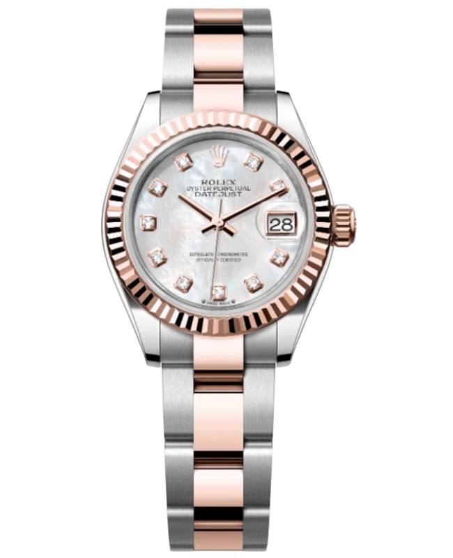 Brand New Authentic Rolex Lady-Datejust 28 Steel and Everose Gold Automatic Mother of Pearl Diamond Dial Women’s Luxury Watch Model M279171-0014. Polished 18K Everose Gold and Oystersteel case with Brushed and Polished 18K Everose Gold and Oystersteel Bracelet watch band. 18K Rose Gold Oysterclasp clasp. Fixed. Fluted bezel. Dial description: Polished Rose Gold Hands and Diamond Hour Markers with the Date at 3 o’clock on a White Mother of Pearl dial. Swiss Automatic. Chronometer movement. Chronograph sub-dials display: Date. Calendar: Date at 3 o’clock. Powered by Rolex Calibre 2236 engine with 55 hours power reserve. Watch functions: Date, Power Reserve, Hour, Minute, Second. Screw Down crown. Scratch Resistant Sapphire crystal. Round case shape. Case size: 28mm. Solid case back. 100 Meters – 330 Feet water resistant. 5-year WatchMaxx warranty. Also known as model: M2791710014.