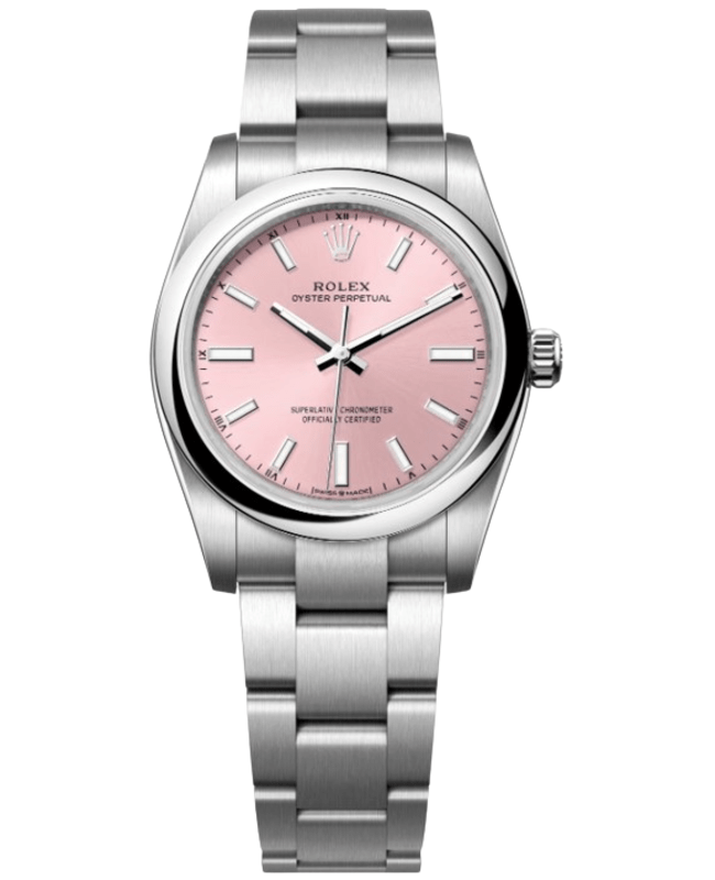Brand New Authentic Rolex Oyster Perpetual 34 Automatic Pink Dial Steel Women’s Fashion Watch Model M124200-0004. Polished Oystersteel case with Brushed and Polished Oystersteel Bracelet watch band. Brushed and Polished Stainless Steel Oysterclasp clasp. Smooth bezel. Dial description: Luminous Silver Tone Hands and Stick Hour Markers with Minute Markers Around the Outer Rim on a Pink dial. Swiss Automatic. Chronometer movement. Powered by Rolex Calibre 2232 engine with 55 hours power reserve. Watch functions: Hour, Minute, Second, Power Reserve. Screw Down crown. Scratch Resistant Sapphire crystal. Round case shape. Case size: 34mm. Solid case back. 100 Meters – 330 Feet water resistant. 5-year WatchMaxx warranty. Also known as model: M1242000004.