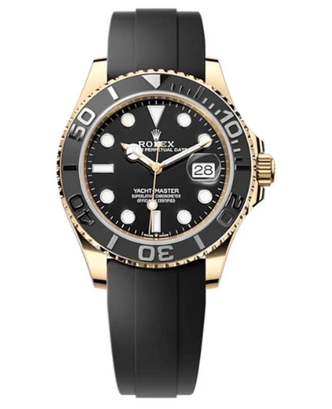 Brand New Authentic Rolex Yacht-Master 42 Black Dial 18kt Yellow Gold Oysterflex Men’s Luxury Watch Model M226658-0001. Polished 18kt Yellow Gold case with Black Oysterflex Band strap. Oysterclasp clasp. Bi-directional Rotating bezel. Dial description: Luminescent White Gold Hands and Index Hour Markers with the Date Displayed at 3, on a Black dial. Automatic – Chronometer movement. Chronograph sub-dials display: Date. Calendar: Date at 3 o’clock. Powered by Rolex Calibre 3235 engine with 70 hours power reserve. Watch functions: Date, Power Reserve, Hour, Minute, Second. Screw in crown. Scratch Resistant Sapphire crystal. Round case shape. Case size: 42mm. Solid case back. 100 Meters – 330 Feet water resistant. 5-year WatchMaxx warranty.